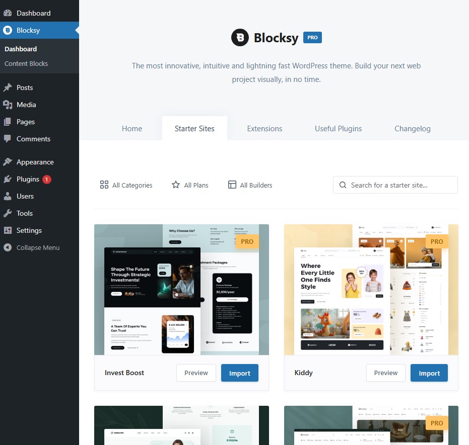 - Professionally Designed Websites using Starter Sites: The ability to import ready-to-use layout packs called starter sites makes Blocksy ideal for users who want to quickly launch a website with a professional look without starting from scratch. These starter sites cover various categories, including e-commerce.